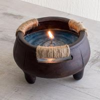 "Designed by Roxana de Papadopolo in Guatemala, this ceramic jar candle creates a soothing ambience and appealing fragrance in the home. The small brown footed pot holds a handcrafted turquoise blue candle with a light lavender scent. The twine-wrapped rim adds a charmingly rustic accent."