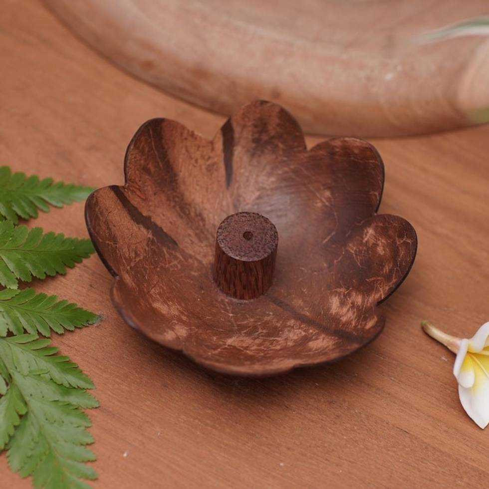 Hand Crafted Brown Coconut Shell Incense Holder from Bali 'Harmony in Petals' Item ID: 2669891806