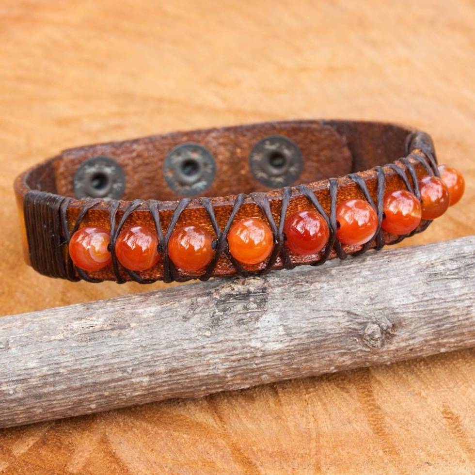 Hand Crafted Carnelian and Leather Band Bracelet 'Rock Walk in Orange' Item ID: 2671801857