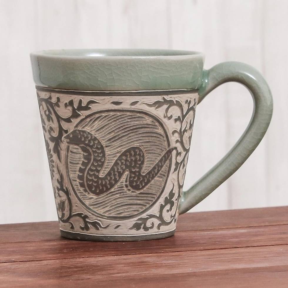 Hand Crafted Ceramic Mug with Snake from Thailand 'Thai Zodiac Snake' Item ID: 2671800819
