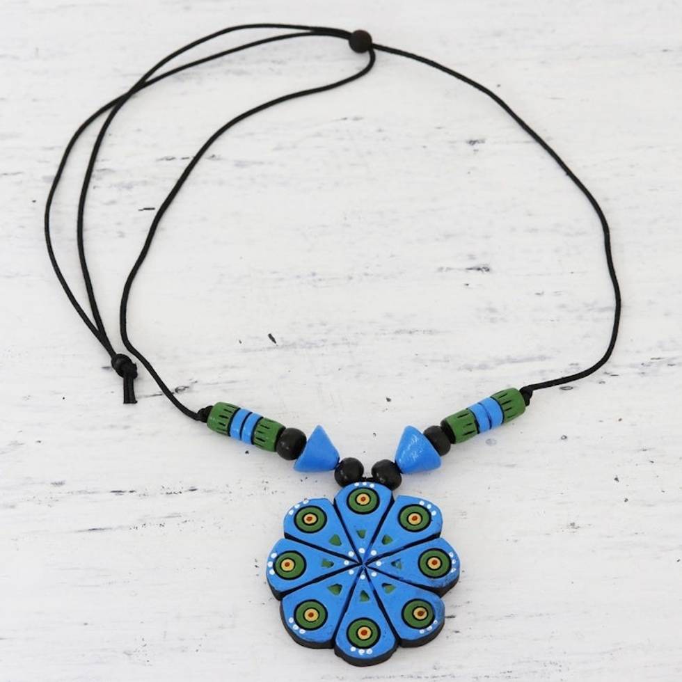 Hand Crafted Ceramic Pendant Necklace from India 'Blue Floral Abstraction' Item ID: 2671791100