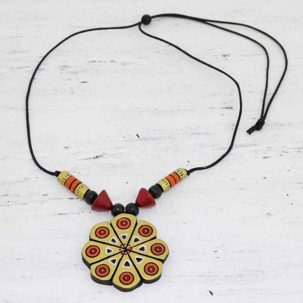 Hand Crafted Ceramic Pendant Necklace from India 'Golden Floral Abstraction' Item ID: 2671791091