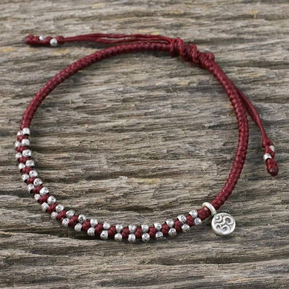 This bracelet is so pretty. It's bright red with Sterling silver beads with a Sterling silver om charm on it. I recommend not getting this wet often bc if u do it will cause the wax to come off the chords. Great buy!!