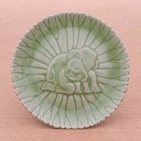Hand Crafted Elephant Motif Celadon Ceramic Plate 'Elephant Nurture' Item ID: 2671800007