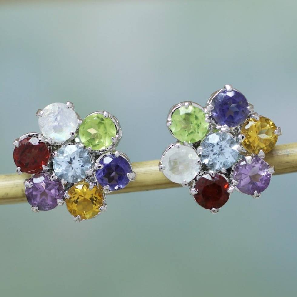Hand Crafted Floral Sterling Silver Button Multigem Earrings 'Flowers' Item ID: 2669924329