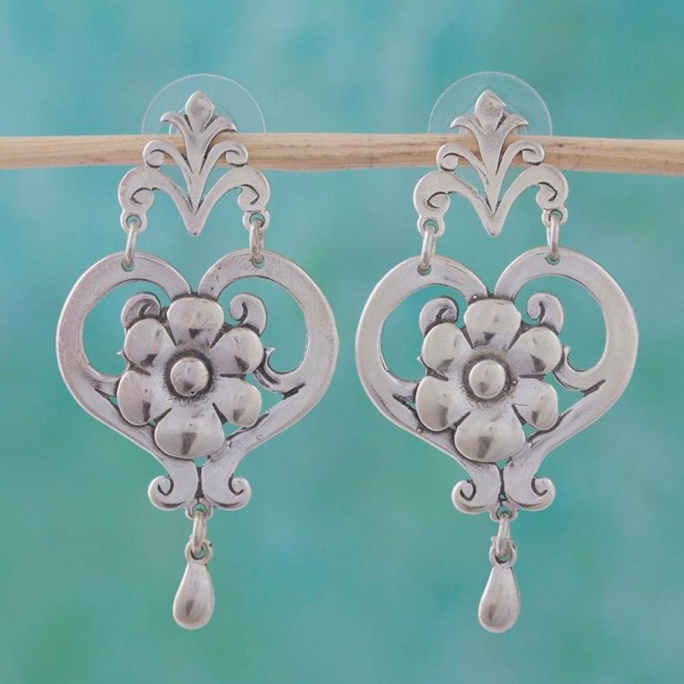 Hand Crafted Floral Sterling Silver Dangle Earrings 'Daisy Hearts' Item ID: 2671809112