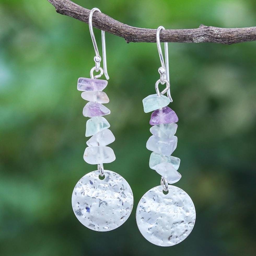 Hand Crafted Fluorite and Sterling Silver Dangle Earrings 'Shining Moon in Purple' Item ID: 2671800254
