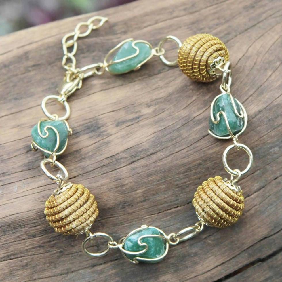 Hand Crafted Green Agate and Golden Grass Link Bracelet 'All Aglow in Green' Item ID: 2669887381