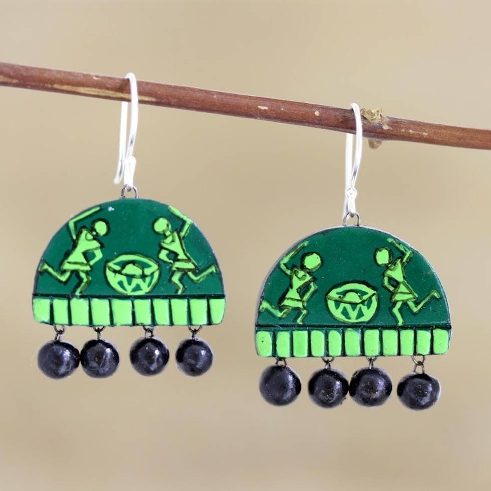 Hand Crafted Green Ceramic Dangle Earrings from India 'Dancing Drummers' Item ID: 2671789859