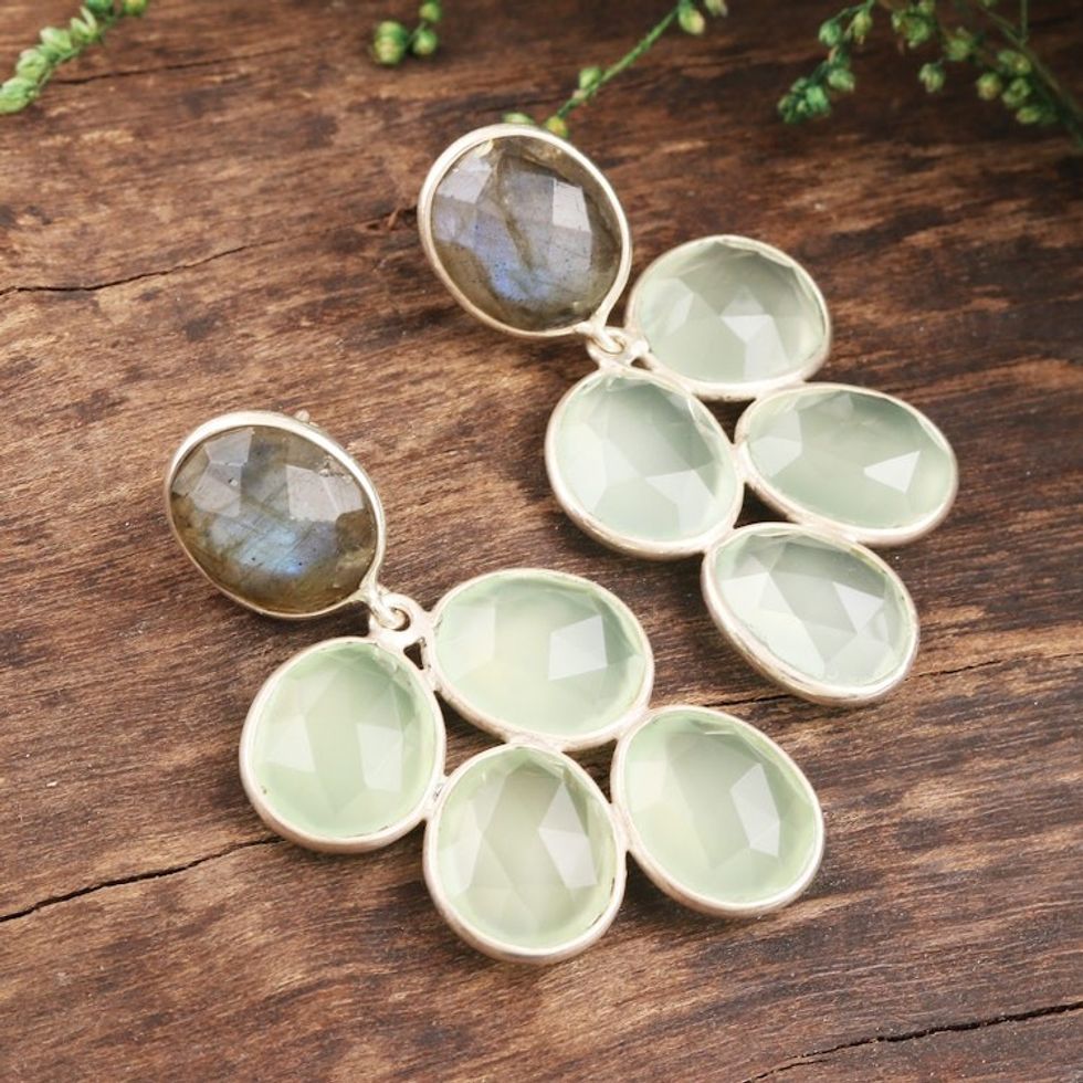 Hand Crafted Labradorite and Green Onyx Dangle Earrings 'Melodic Cluster in Light Green' Item ID: 2671789758