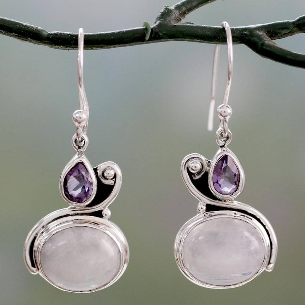Hand Crafted Moonstone and Amethyst Dangle Earrings 'Glistening Beauty' Item ID: 2671618865