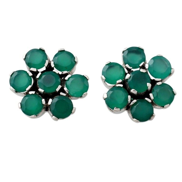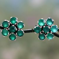 Hand Crafted Onyx and Sterling Silver Floral Button Earrings 'Green Blossom' Item ID: 2671620903