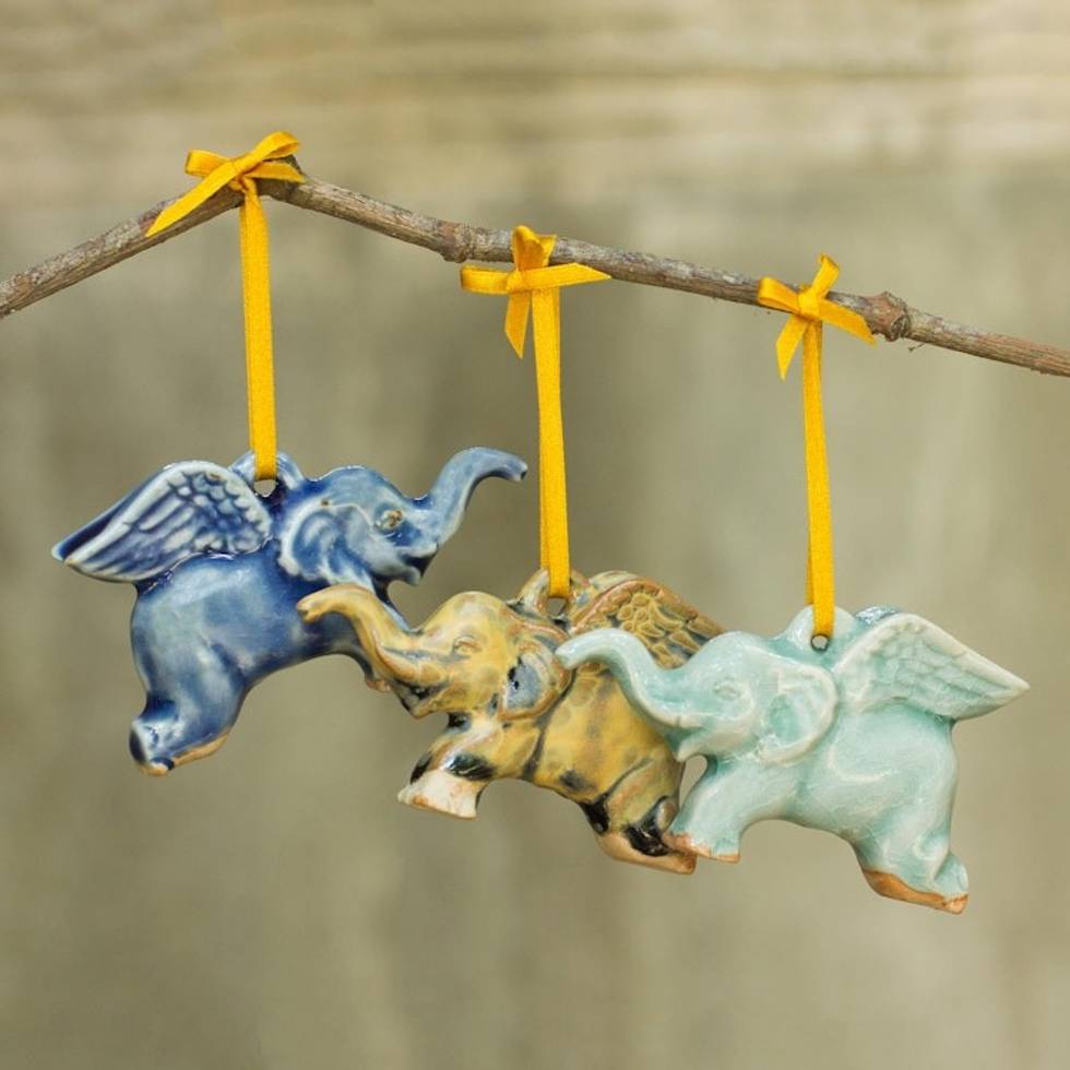 Hand Crafted Ornaments in Celadon Ceramic Set of 3 'Flying Elephants' Item ID: 2669897490