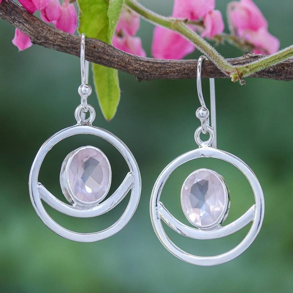 Hand Crafted Rose Quartz Dangle Earrings 'Grinning Moon in Pink' Item ID: 2671799917