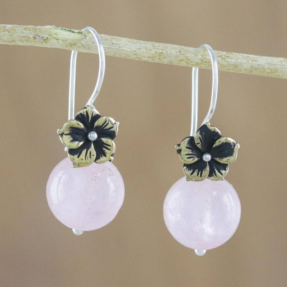 Hand Crafted Rose Quartz Dangle Earrings with Brass Flower 'Lunar Florescence' Item ID: 2671801133