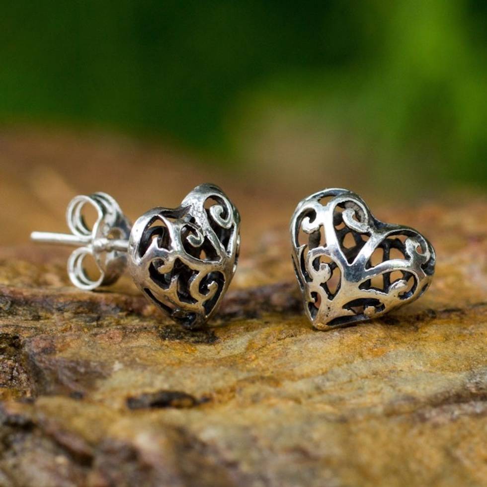 Hand Crafted Sterling Silver Filigree Heart Post Earrings 'Filigree Love' Item ID: 2669930219