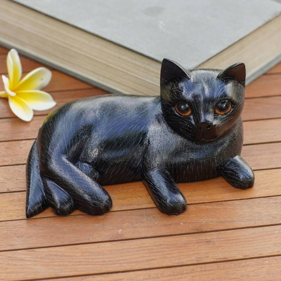 Hand Crafted Suar Wood Cat Statuette 'Feline Friend in Black' Item ID: 2671747259