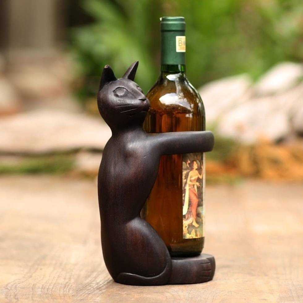Hand Crafted Suar Wood Cat Wine Holder 'Black Cat Hug' Item ID: 2671745718