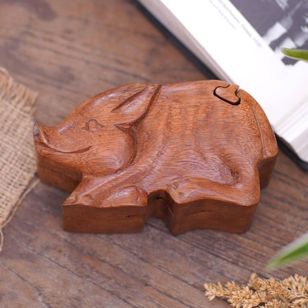 Hand Crafted Suar Wood Puzzle Box with Pig Motif 'Piggy's Secret' Item ID: 2671748094
