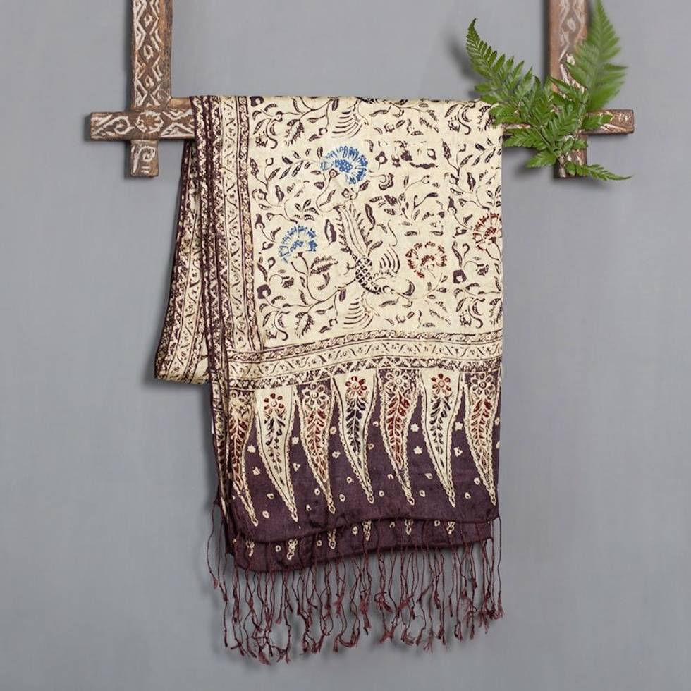This absolutely gorgeous shawl is made from some of the finest silk I've ever had the privilege to touch. It is so soft and light, yet sturdy and the batikking is impeccable! I love the black version, as it shows up the print so beautifully! It almost has a vintage Arts and Crafts feel to the pattern. Nice enough to display in one's home - the bedroom perhaps...? I have since thought of getting another color either for myself or a very good friend or family member...well worth it.