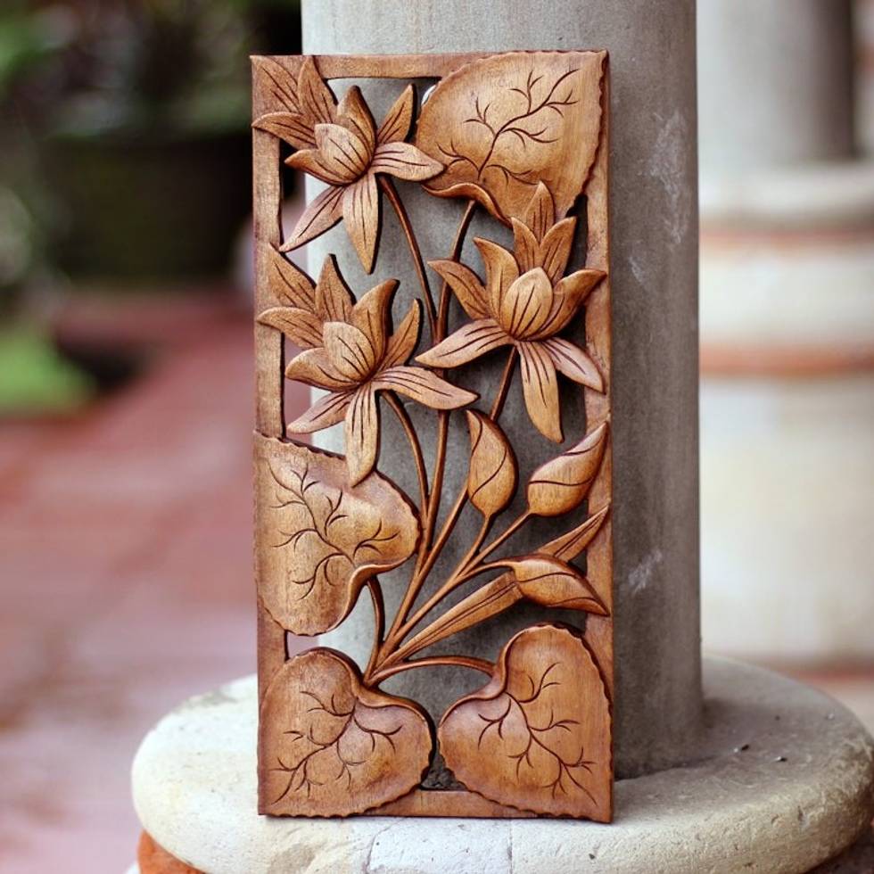 Hand Crafted Wood Floral Relief Panel 'Love Lotus' Item ID: 2671698746