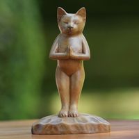 Hand Crafted Wood Sculpture 'Cat Gives Thanks' Item ID: 2671700353