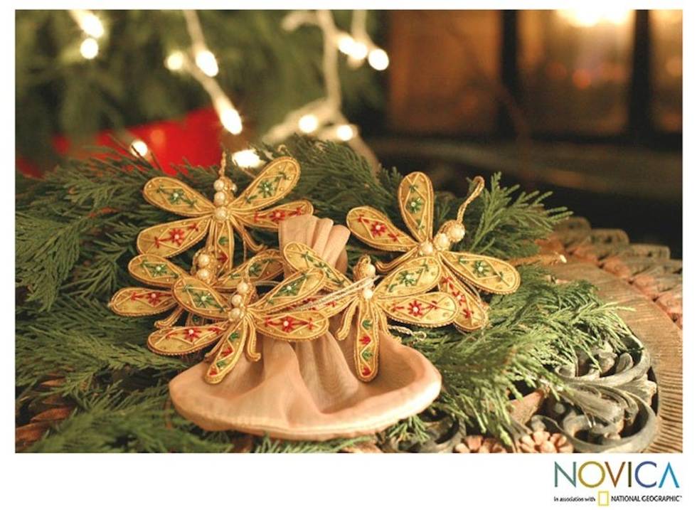 Hand Crafted Yellow Beaded Ornaments from India Set of 5 'Dragonfly Magic' Item ID: 2671619928