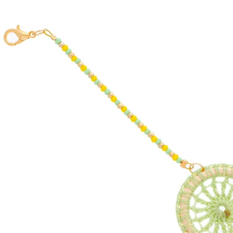 "Inspired by Greek mythology, artisan Monserrat Dominguez in Mexico creates this unique pendant bracelet. She names this style 'Daphne', after the Greek water nymph who is transformed into a laurel tree. The bracelet features a round hand-crocheted pendant in pistachio, flanked by strands of glass beads and 14k gold-plated beads."