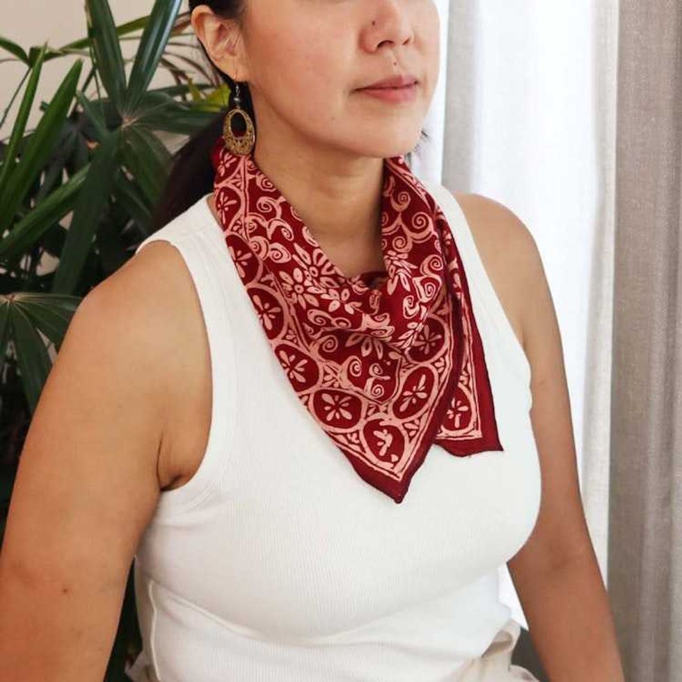 This is a hand-dyed and hand-stamped batik bandana, handmade by artisans. This fabric is handmade by artisans in Java using centuries old wax & dye batik technique.