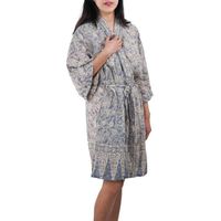 This batik kimono robe is made from white cotton fabric that is then hand-stamped and hand-dyed using 700 years old batik wax and dye technique. The batik fabric is also then sun baked.