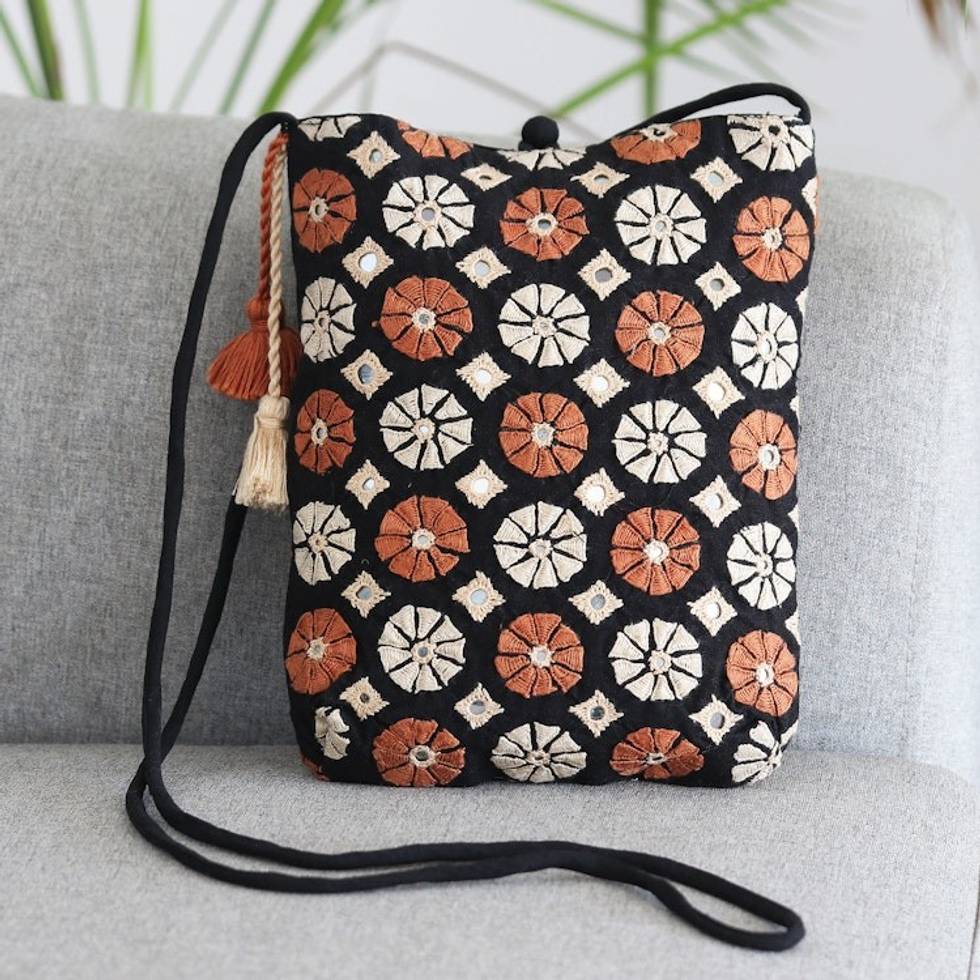 Hand-Embroidered Cotton Sling Bag from India 'Spinning Blossoms' Item ID: 2669924556