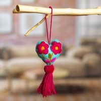 Hand-Embroidered Heart-Shaped Blue Wool Felt Ornament 'Bright Floral Heart' Item ID: 2669897317