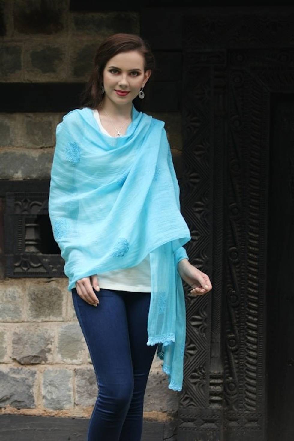 Hand Embroidered Sky Blue Cotton Blend Shawl from India 'Lucknow Bouquet in Blue' Item ID: 2671793096