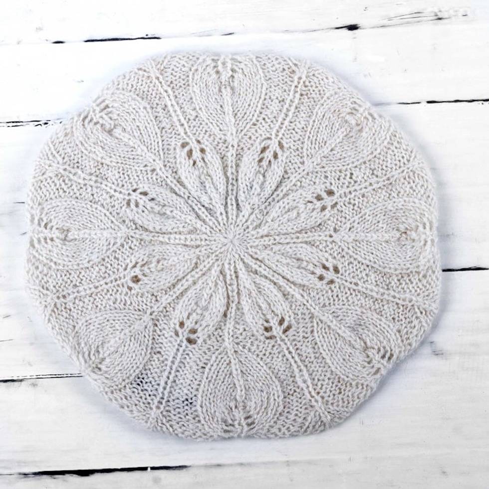 Hand Knit Andean 100 Alpaca Women's Beret in Ivory 'Ivory Leaves' Item ID: 2669891220