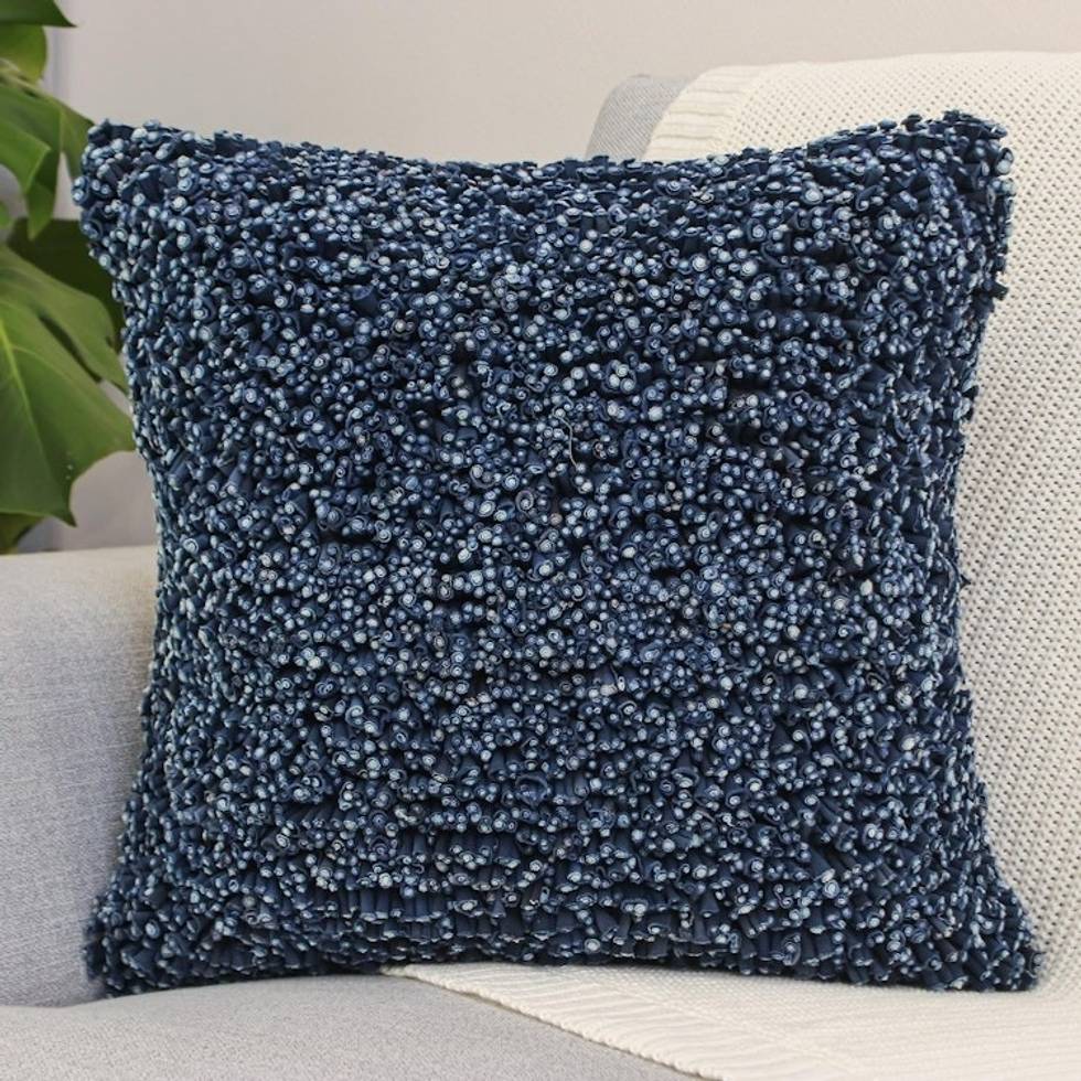 Hand Knit Navy Cotton Cushion Cover from Thailand 'Popcorn in Navy' Item ID: 2671800482