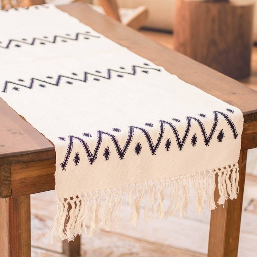 Hand-Loomed Geometric Fringed Ivory Cotton Table Runner 'Geometric Dreams' Item ID: 2671768965