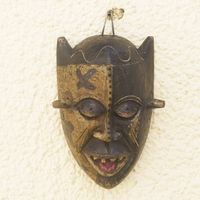"Emmanuel Austin Ankude in Ghana crafts this expressive mask to honor the Kongo people, a Bantu ethnic group who have lived along the Atlantic coast of Africa. The artisan hand carves the mask from sese wood with a protruding tongue, then paints the surface in harmonious shades of brown."