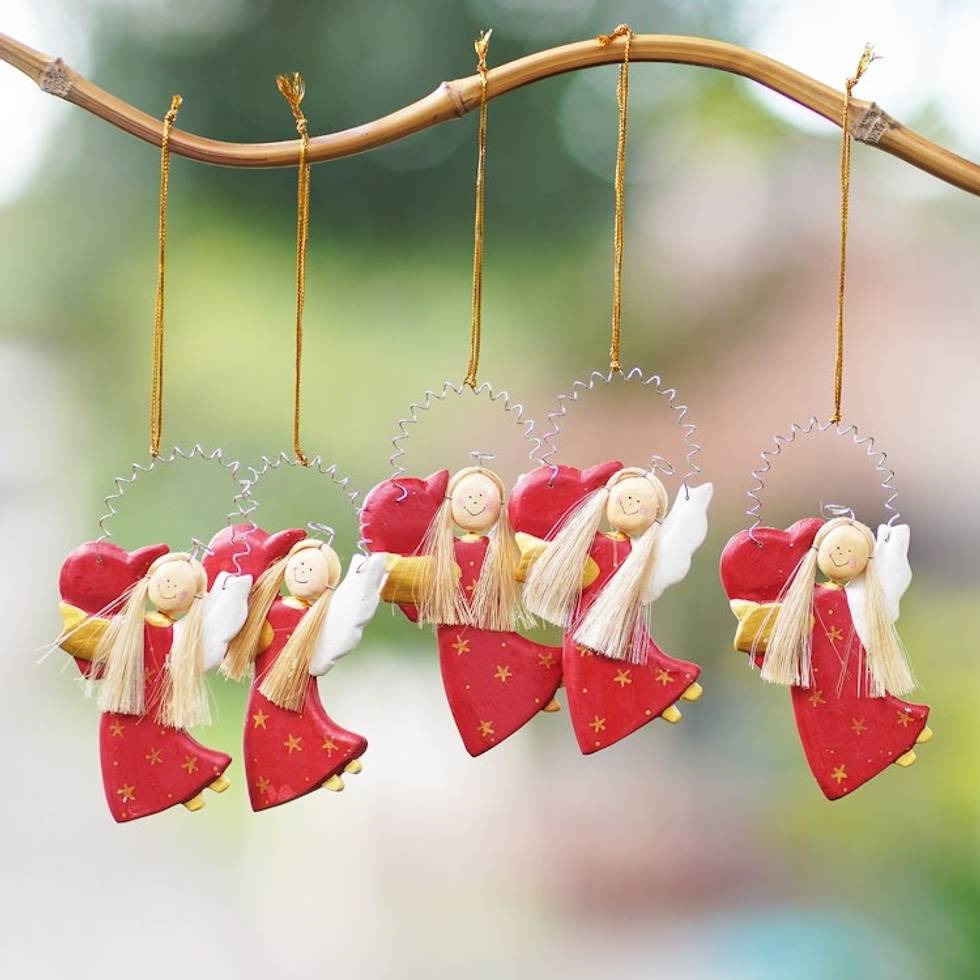 Hand Made Albesia Wood Holiday Ornaments Set of 5 'Love Delivery in Red' Item ID: 2671747234