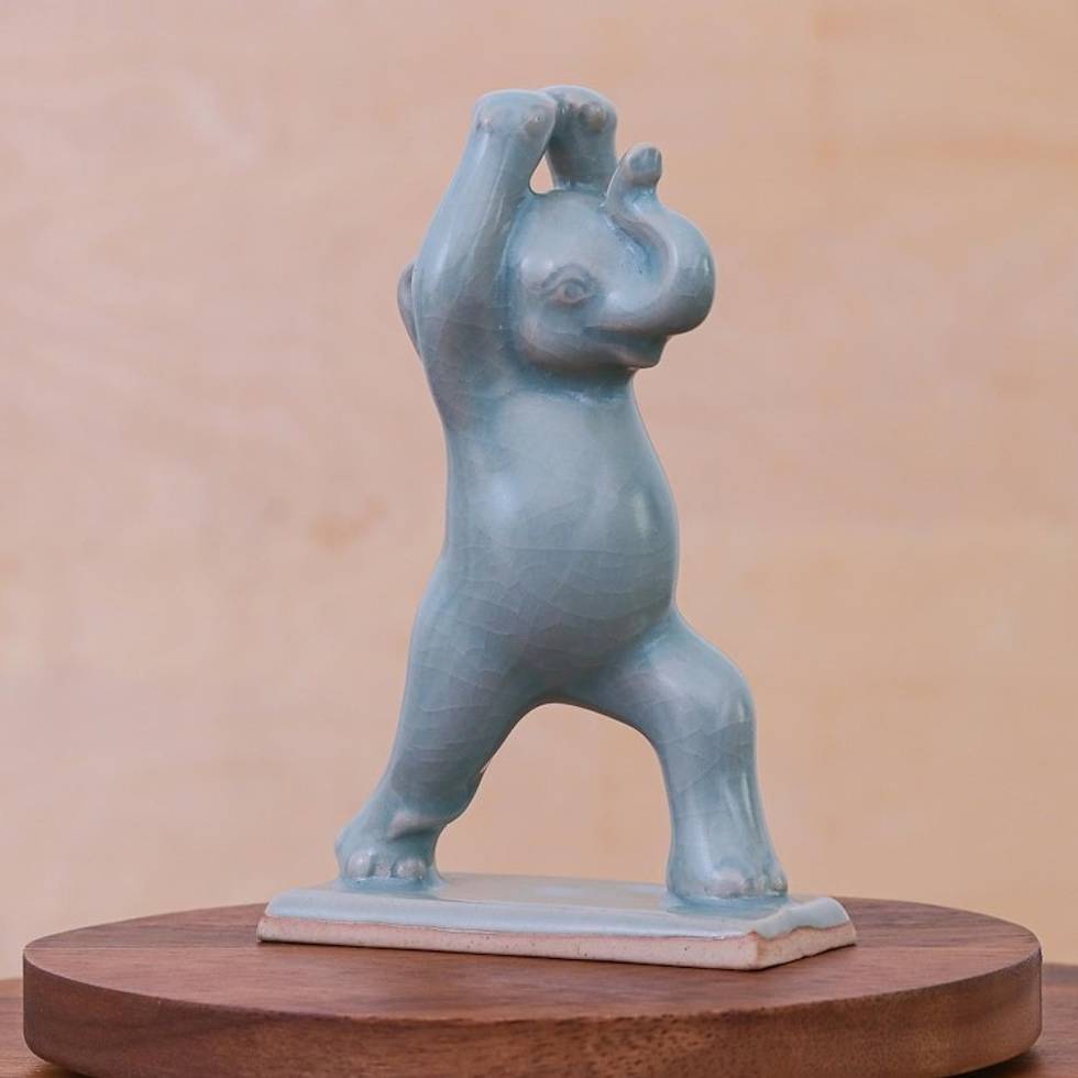 Hand Made Celadon Ceramic Elephant Yoga-Themed Figurine 'Elephant Warrior Pose' Item ID: 2671799678