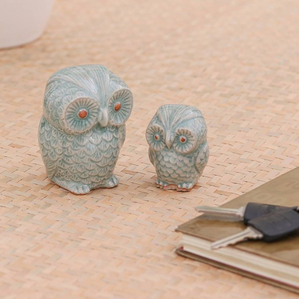 Hand Made Celadon Ceramic Owl Figurines from Thailand Pair 'Little Light Blue Owls' Item ID: 2671802205