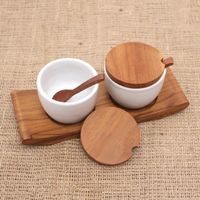 Hand Made Ceramic and Teak Wood Condiment Set 'Flavor Duo in White' Item ID: 2671745255