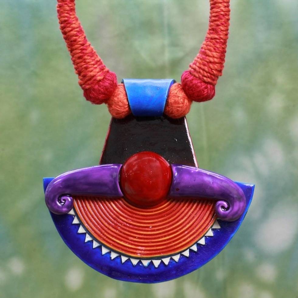 Hand Made Ceramic Cotton Necklace Red Orange from India 'Sun Energy' Item ID: 2671793769