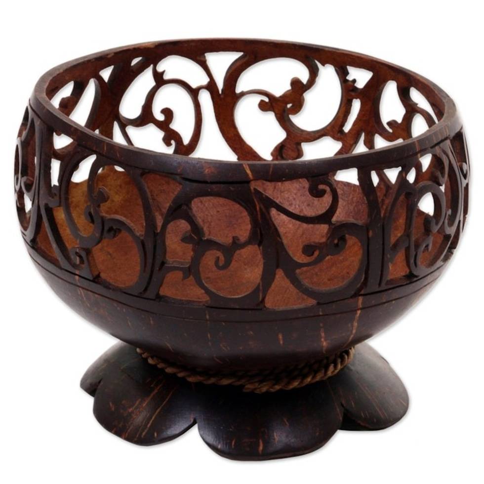 "A tribute to the late Indonesian artisan Putra Suteja, this catchall serves as excellent decoration, also handy for storing small items. The coconut shell features a hand-carved design, with open spiral motifs traveling around the surface with agel grass cord wrapped above the base."