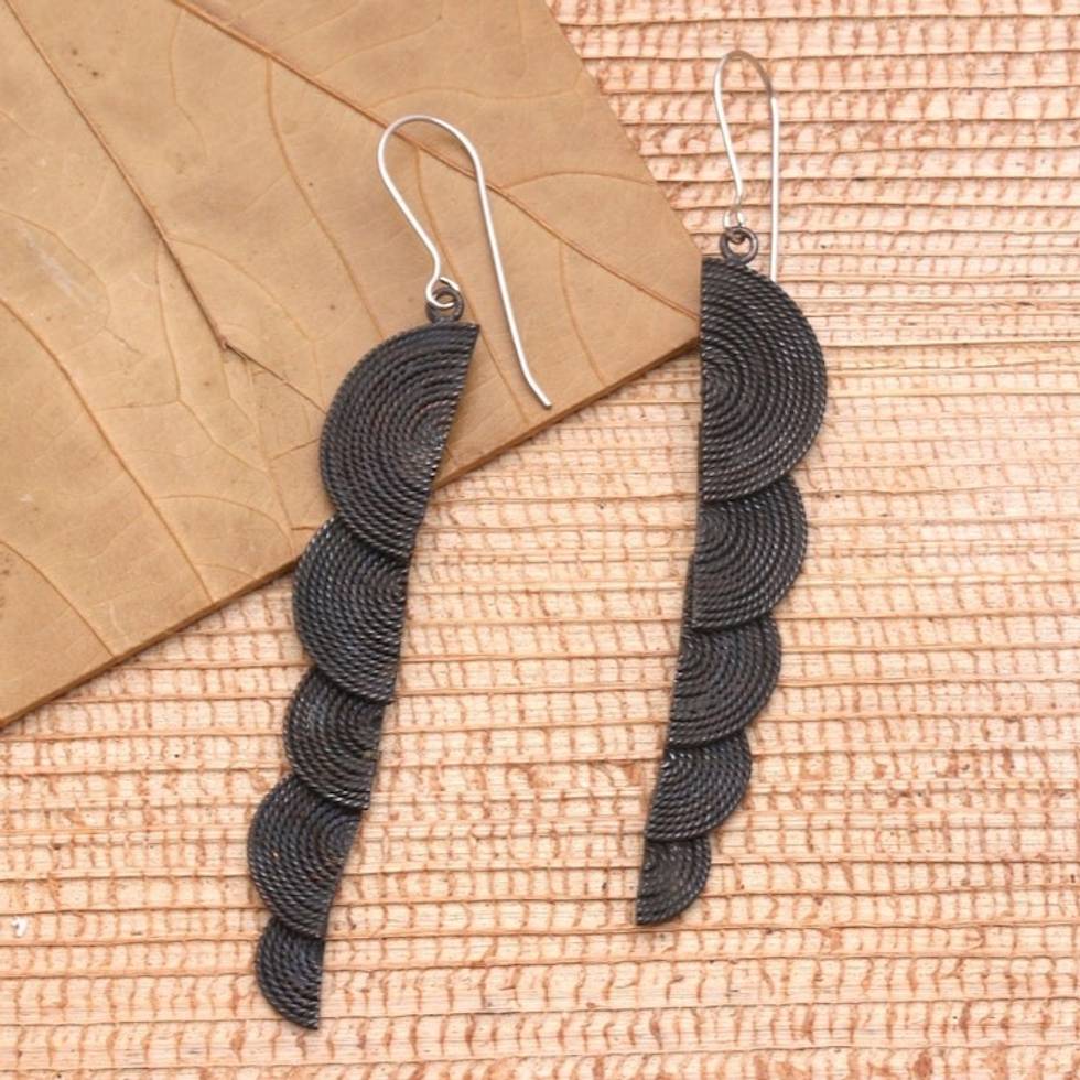 "Agus Suryanto in Java handcrafts a series of semicircles to create these pretty dangle earrings. He first twists copper strands for a rope-like look, then creates a dark, oxidized finish. The pair is worn on stainless steel hooks."