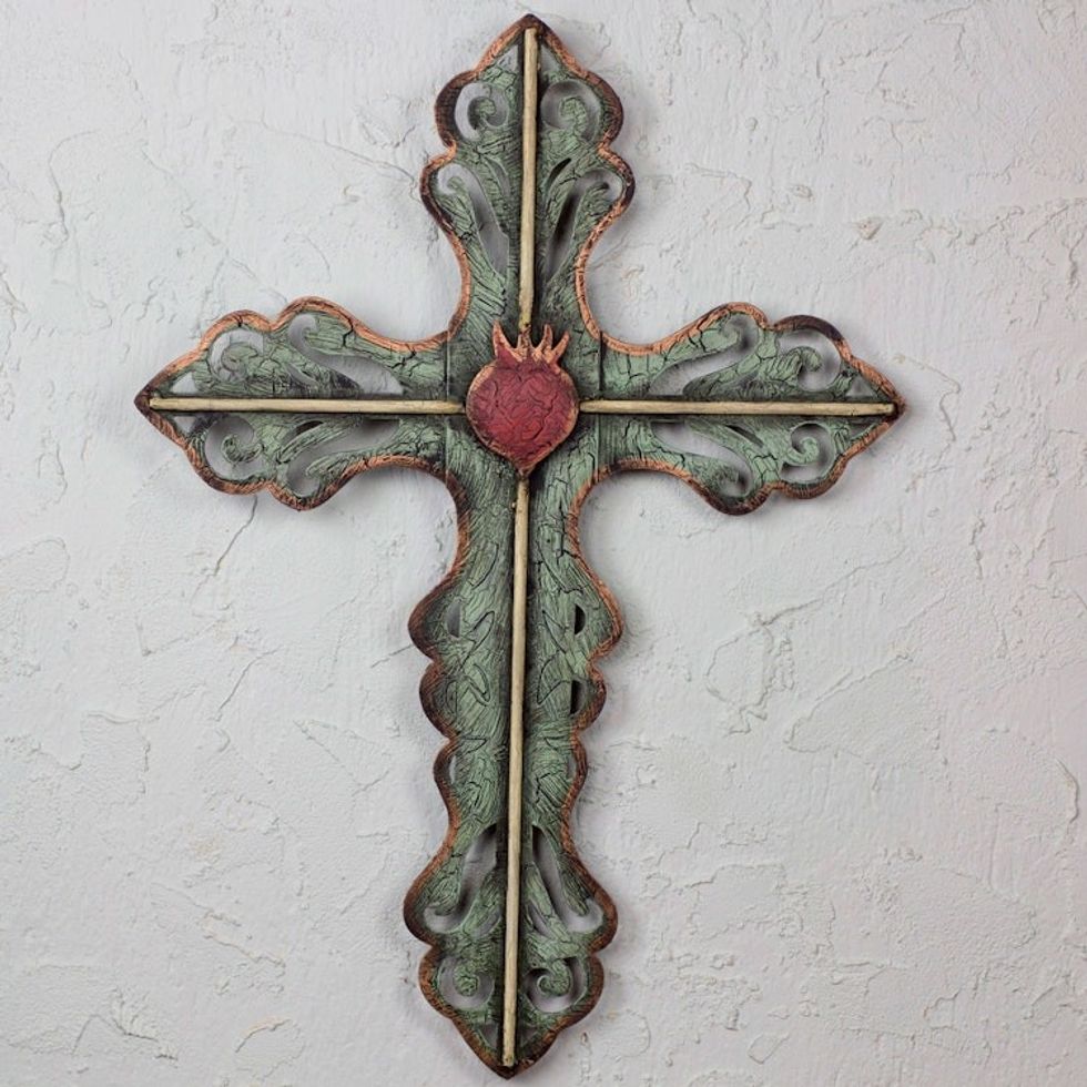 Hand Made Cross Green Religious Steel Wall Sculpture Mexico 'Jesus Sacred Heart on Fire...' Item ID: 2671809000