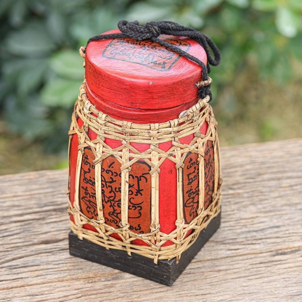 "Woven from bamboo, this decorative jar designed by Jaifah Aksornsri is eye-catching home accent. The artisan covers the bamboo in clay, then paints the surface red with Northern Thai old alphabetic symbols. A woven rattan cage decorates the outside of the jar, while a raintree wood base provides a sturdy resting place. Finally, a black cotton rope stretches over the jar's lid."