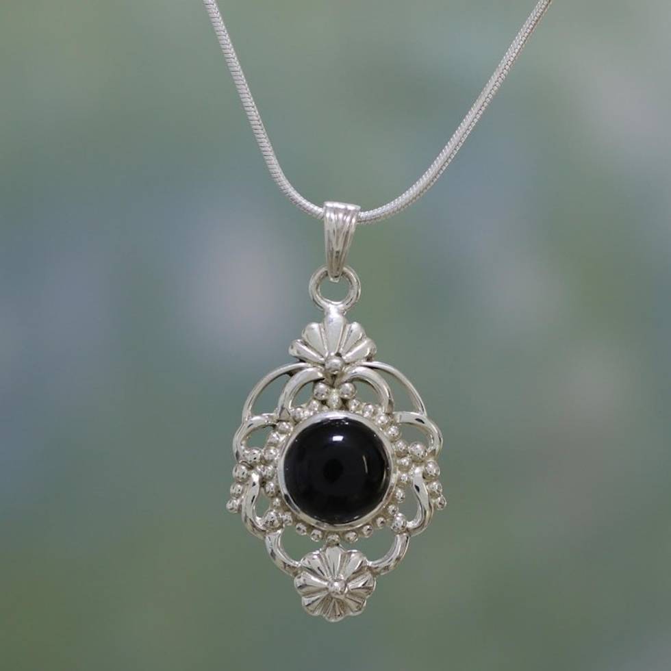 Hand Made Floral Sterling Silver and Onyx Necklace 'Baroque Blossom' Item ID: 2671794430