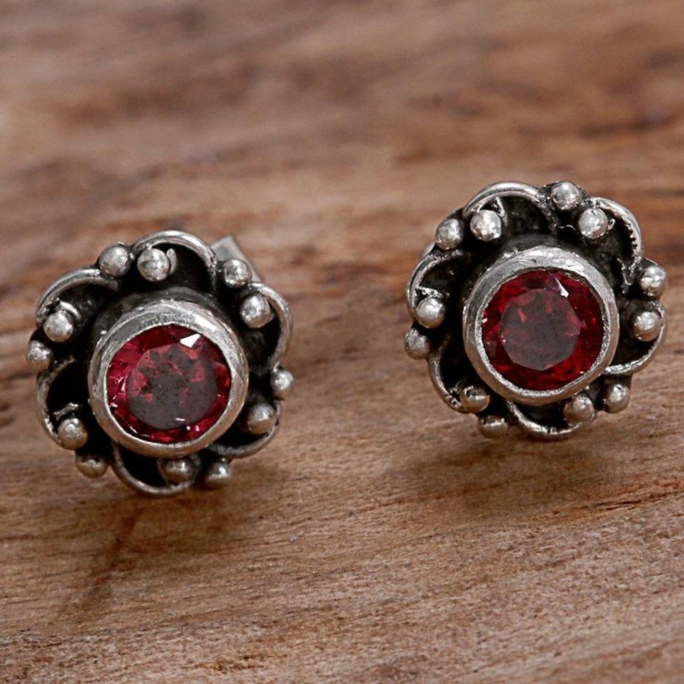 Hand Made Garnet and Sterling Silver Flower Stud Earrings 'Little Happiness in Red' Item ID: 2671478040