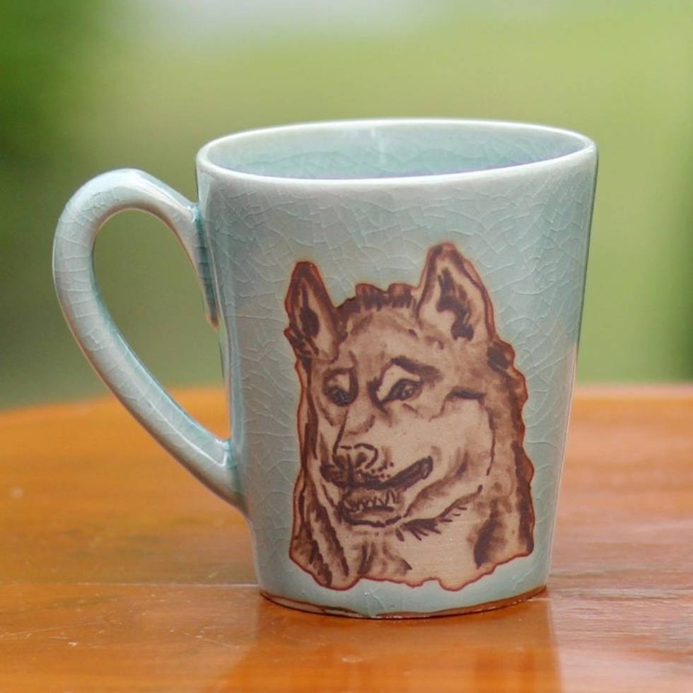 Hand Made Green Celadon Ceramic Painted Thai Wolf Mug 'Lupine Libation' Item ID: 2671801835