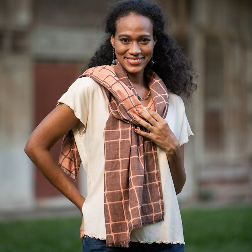 Hand Made Gridded Cotton Scarf 'Warm City' Item ID: 2669894246